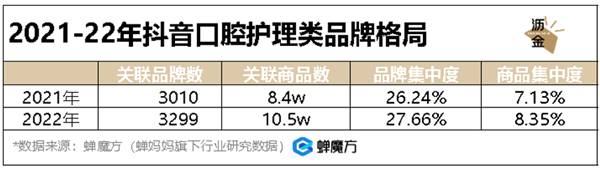 口腔护理的关联品牌总数由2021年的3010家上升到2022年的3299家,但关联商品数增长较为明显,从8.4万个上升到10.5万个,增幅高达25%。
