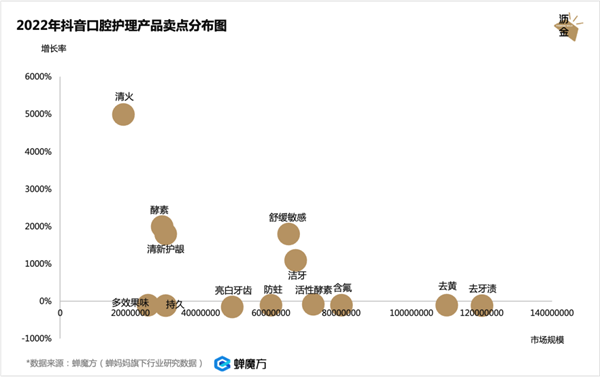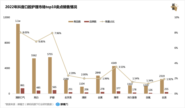 值得注意的是,虽然打着“口腔健康”相关概念的产品在2022年增速迅猛,但其总销售额加起来占比却不算高。