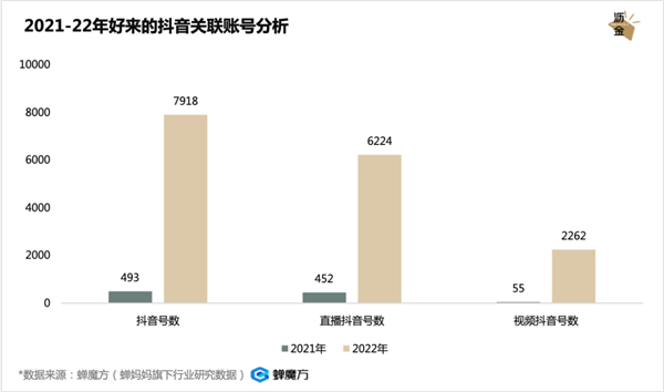 2022年好来关联抖音号的数量从493个大涨到7918个,增长了近15倍。而直播抖音号数也从452个上涨到6224个,视频抖音号数量从55个增长到2262个。