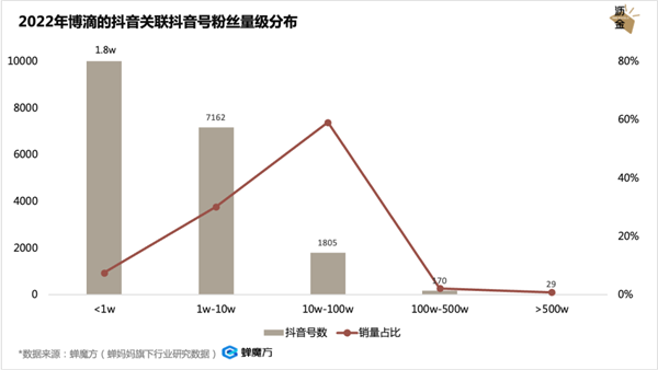 2022年博滴的抖音关联抖音号粉丝量级分布